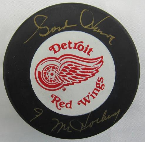 Detroit Red Wings logo hockey puck has been hand-signed and inscribed by Gordie Howe (HOF, D. 2016).