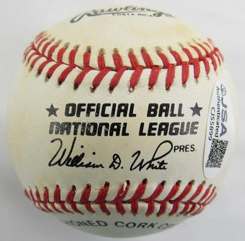 Rawlings Official National League Baseball. Hand-signed and inscribed by Ozzie Smith (St. Louis Cardinals, HOF). Please note, the baseball is naturally toned.