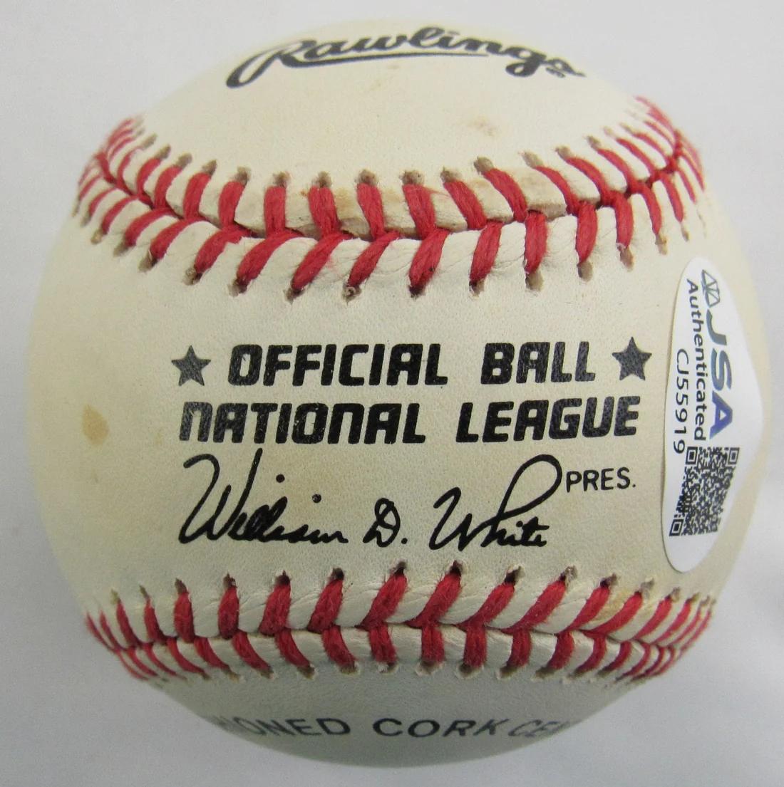 Rawlings Official National League Baseball. Hand-signed by Enos Slaughter (D. 2002, St. Louis Cardinals, HOF). Please note, the baseball is naturally toned and stained.