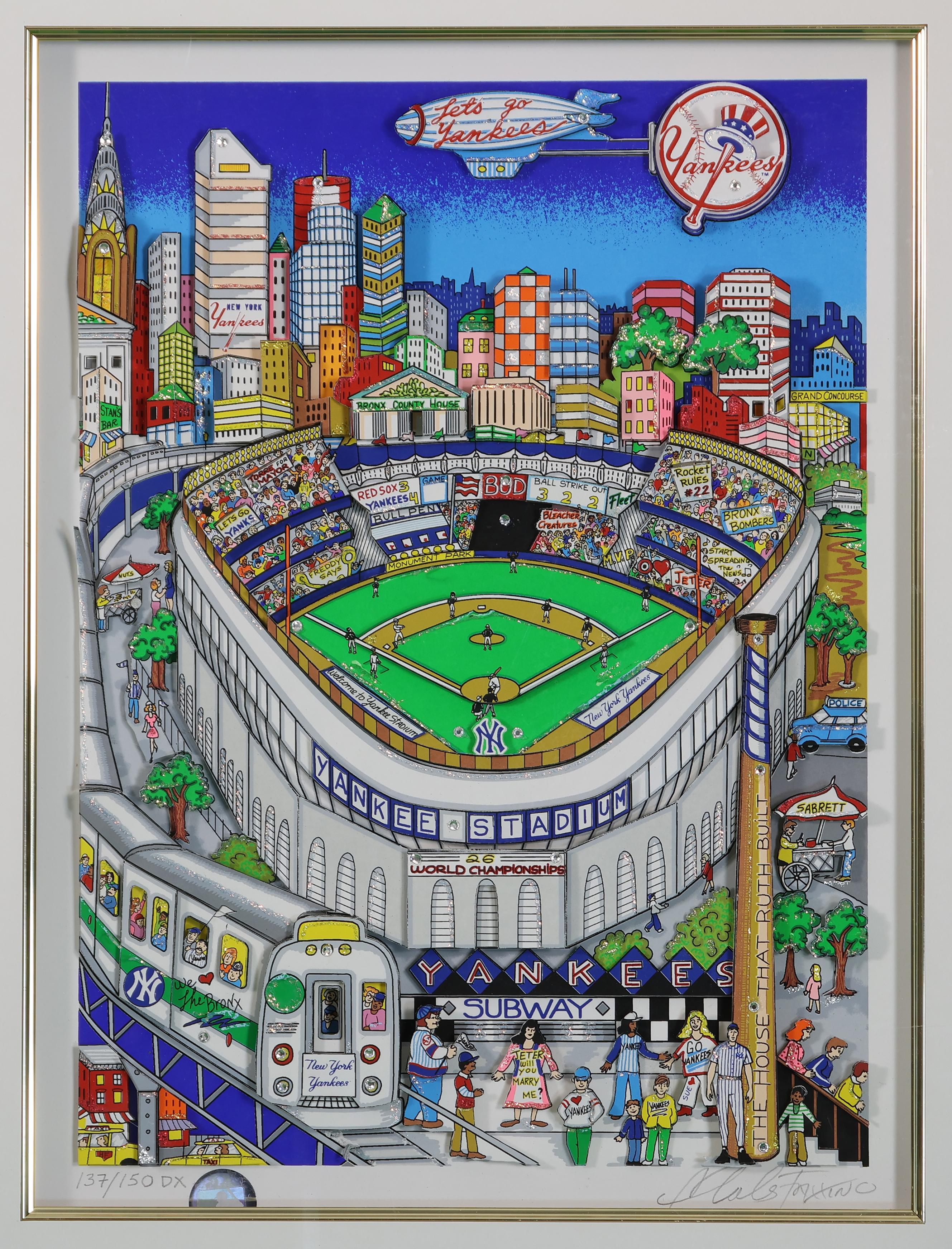 Custom frame measures 24.5" x 28.5" in size and features a "Let's Go Yankees" 3-D pop art serigraph by Charles Fazzino. This item is limited edition and has been numbered #137/150.