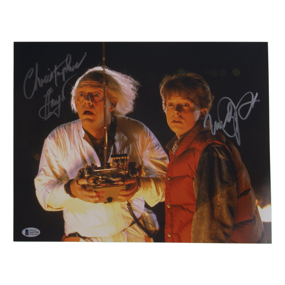 Photo measures 11" x 14" in size and has been hand-signed by Michael J. Fox (Marty McFly) and Christopher Lloyd (Dr. Emmett "Doc" Brown).
