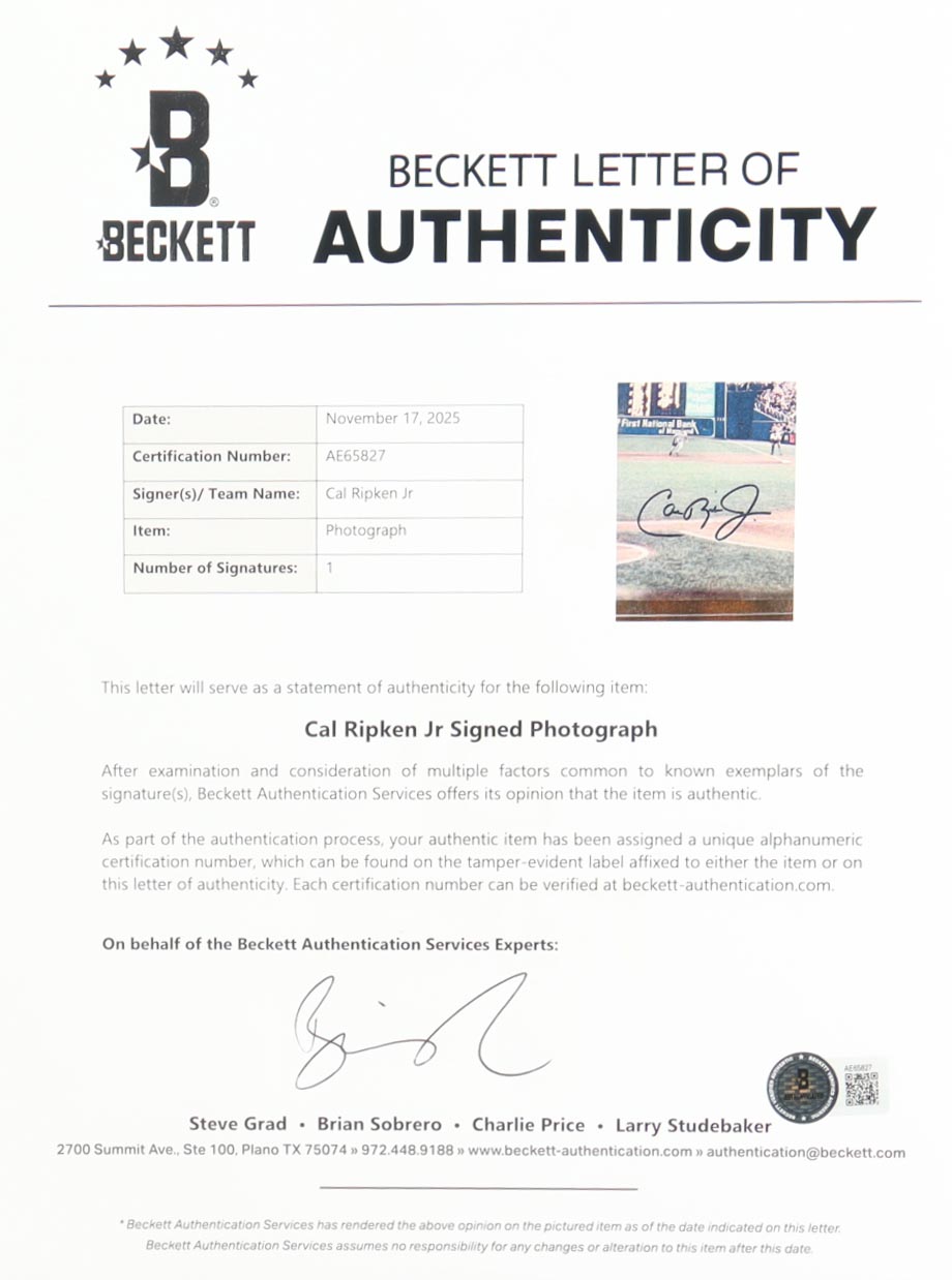 Custom photo plaque display measures approximately 11" x 14" in size. Display features an 8" x 10" photograph that has been hand-signed by Cal Ripken Jr. (Baltimore Orioles, HOF). Display also features a name and statistics plate.