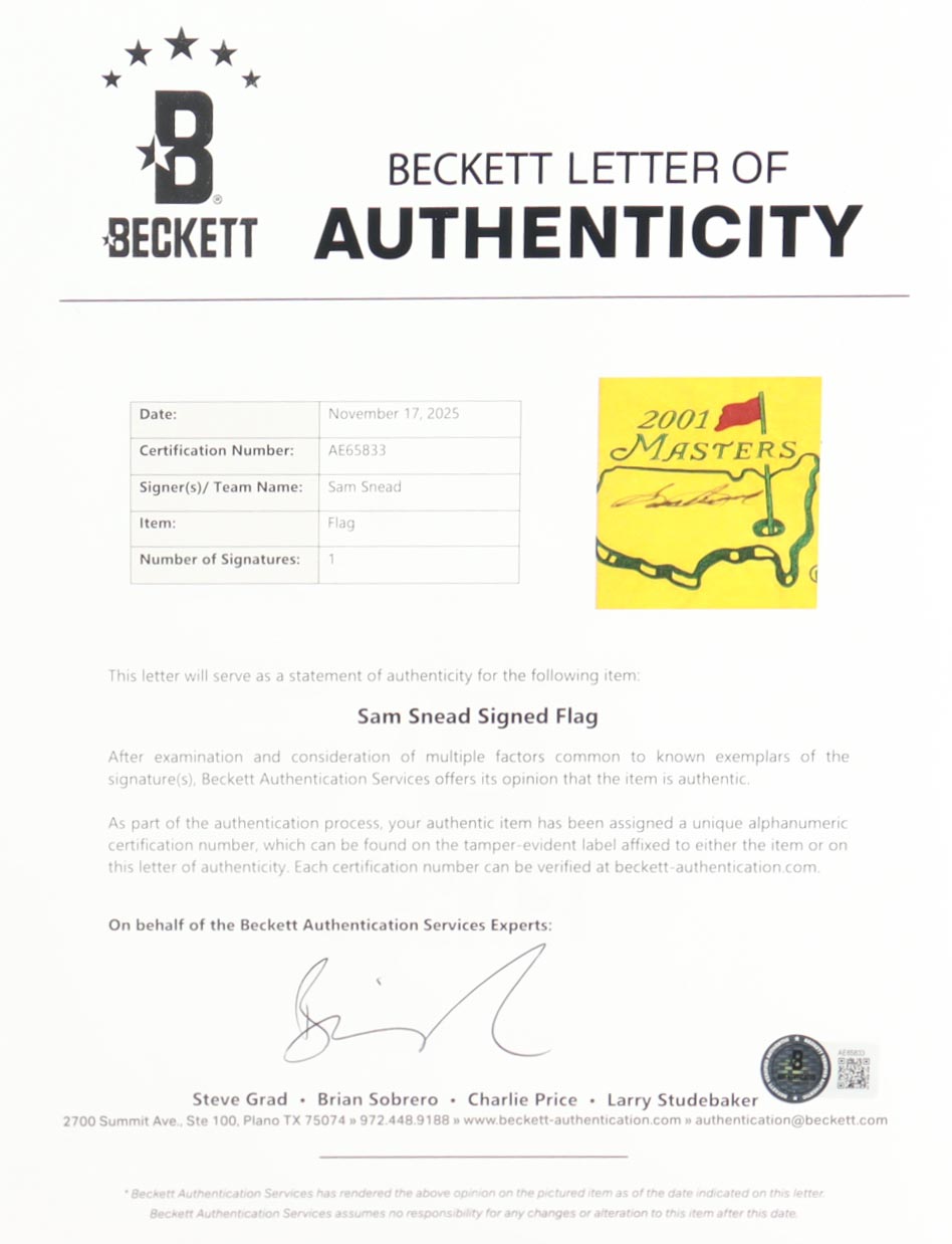 Sam Snead Signed Custom Framed 2001 The Masters Tournament Golf Pin Flag (Beckett)