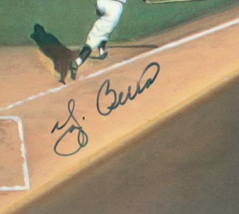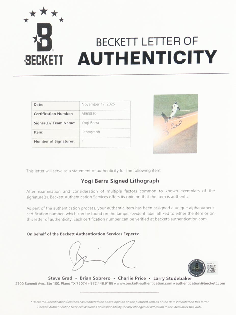 Custom frame measures approximately 26" x 30" in size. Lithograph is hand-signed by Yogi Berra (New York Yankees, HOF).