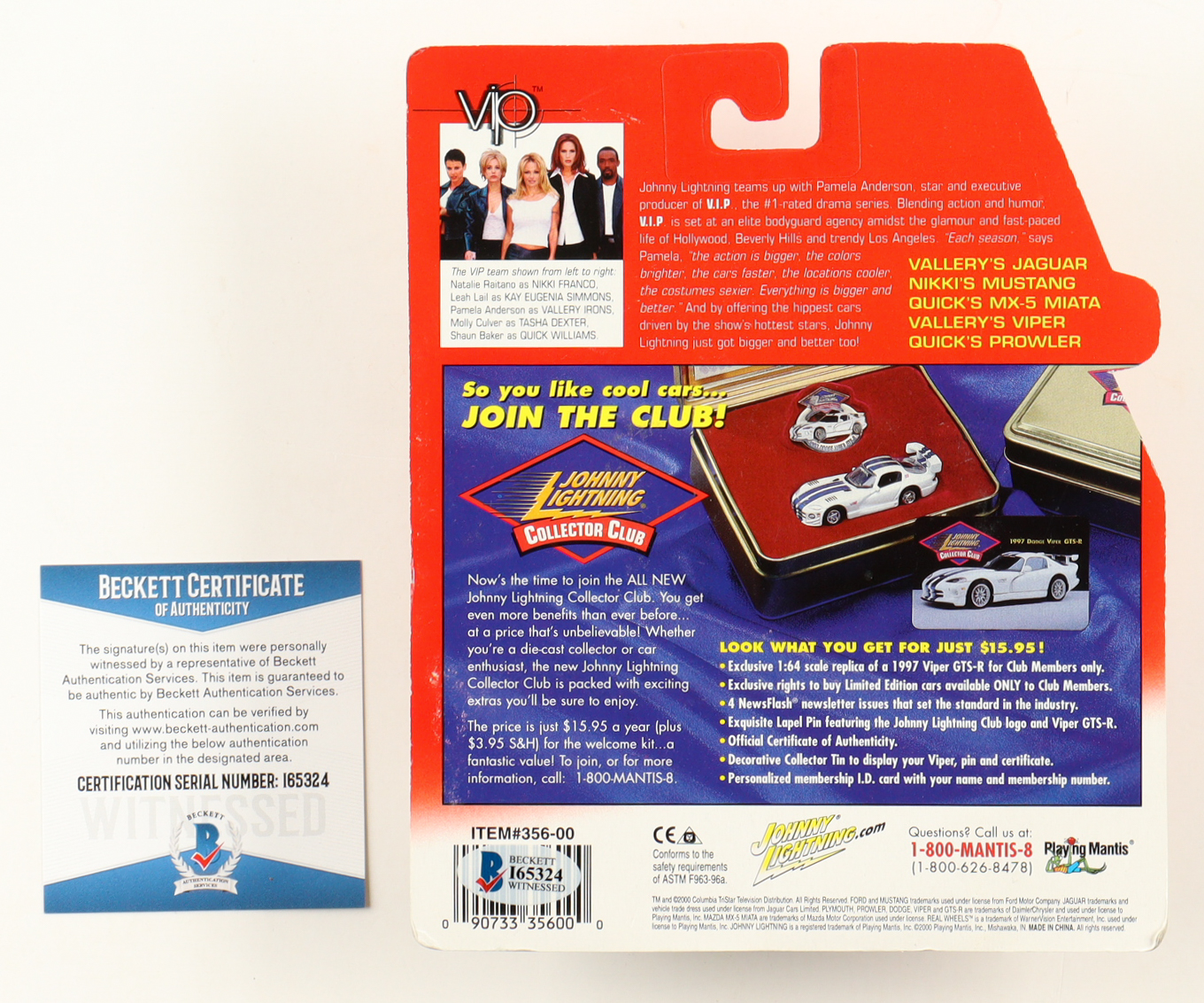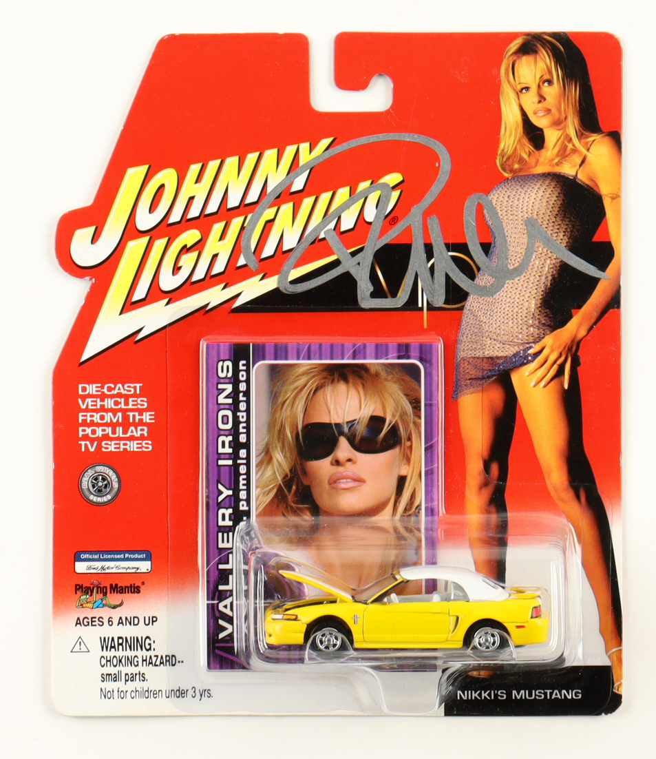 Johnny Lightning diecast car. Hand-signed by Pamela Anderson (Vallery Irons). A trading card is included as well.