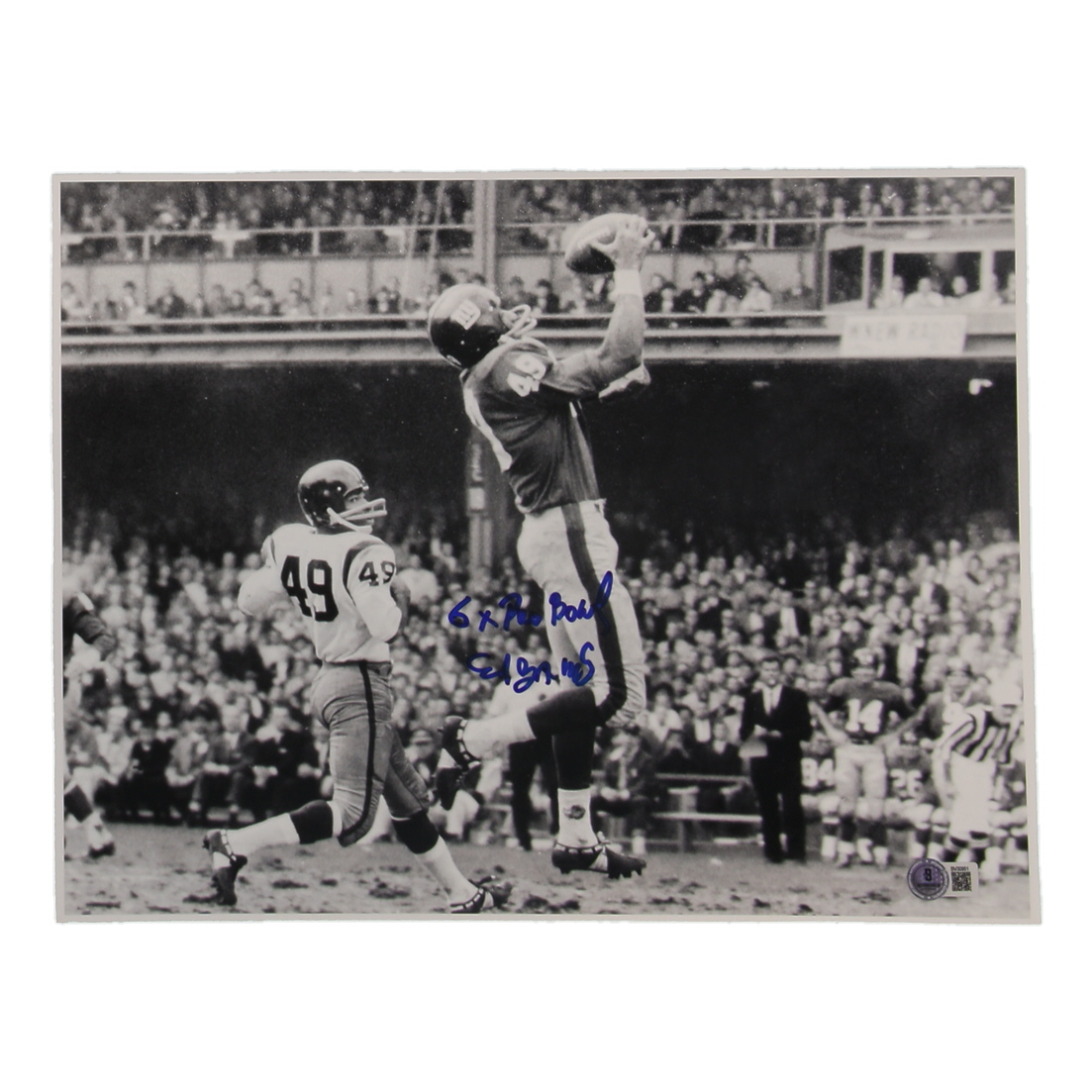 Photo measures 11" x 14" in size. Hand-signed and inscribed by Erich Barnes (New York Giants).