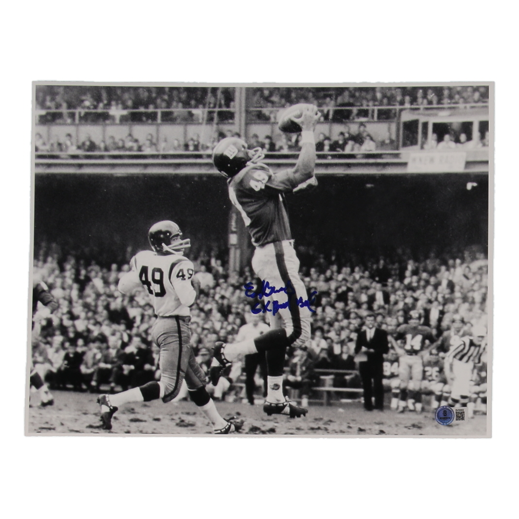 Photo measures 11" x 14" in size. Hand-signed and inscribed by Erich Barnes (New York Giants).