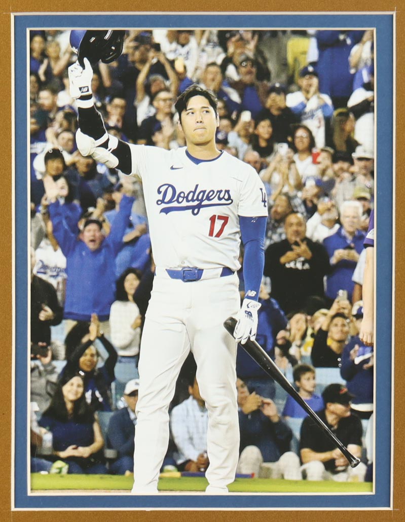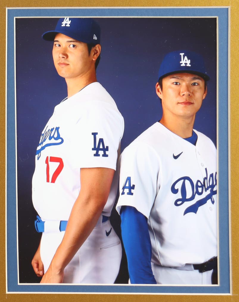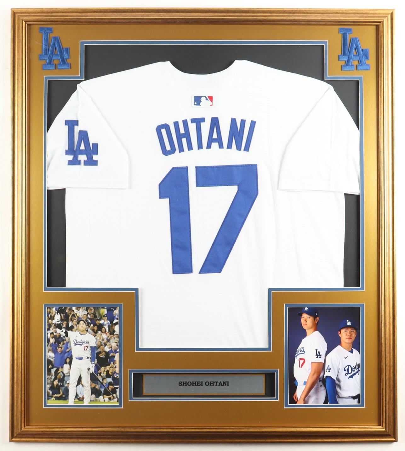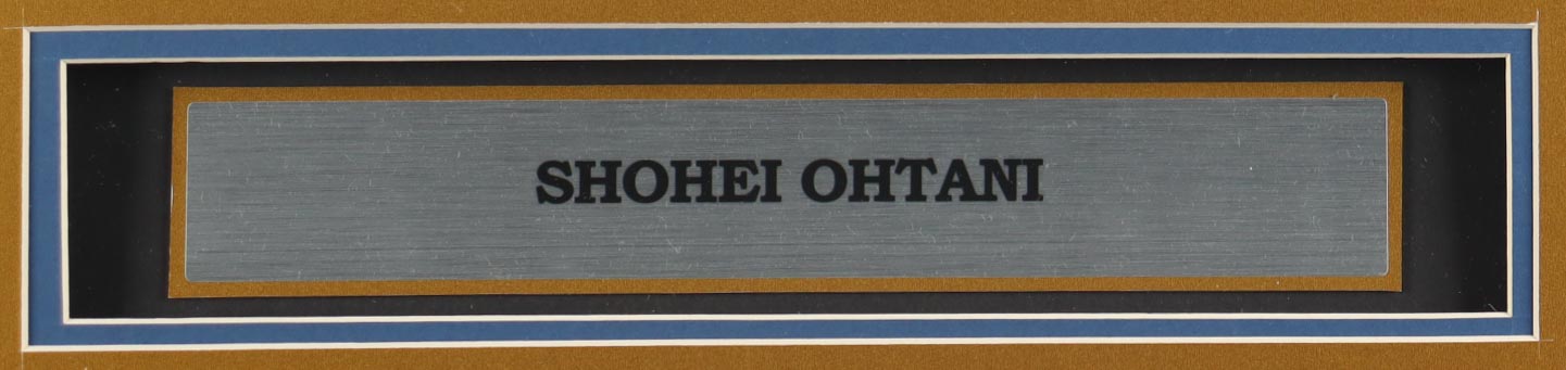 Custom frame measures approximately 33" x 37" in size and features an unsigned Shohei Ohtani jersey. The display also includes (2) Photos, name plaque. Please note, the display is unsigned.