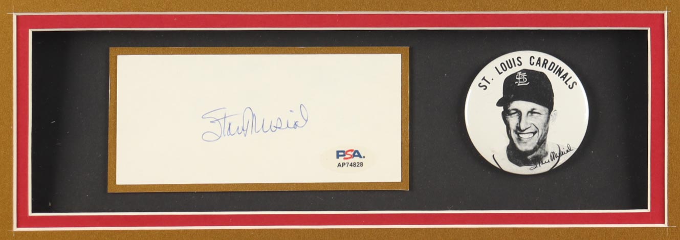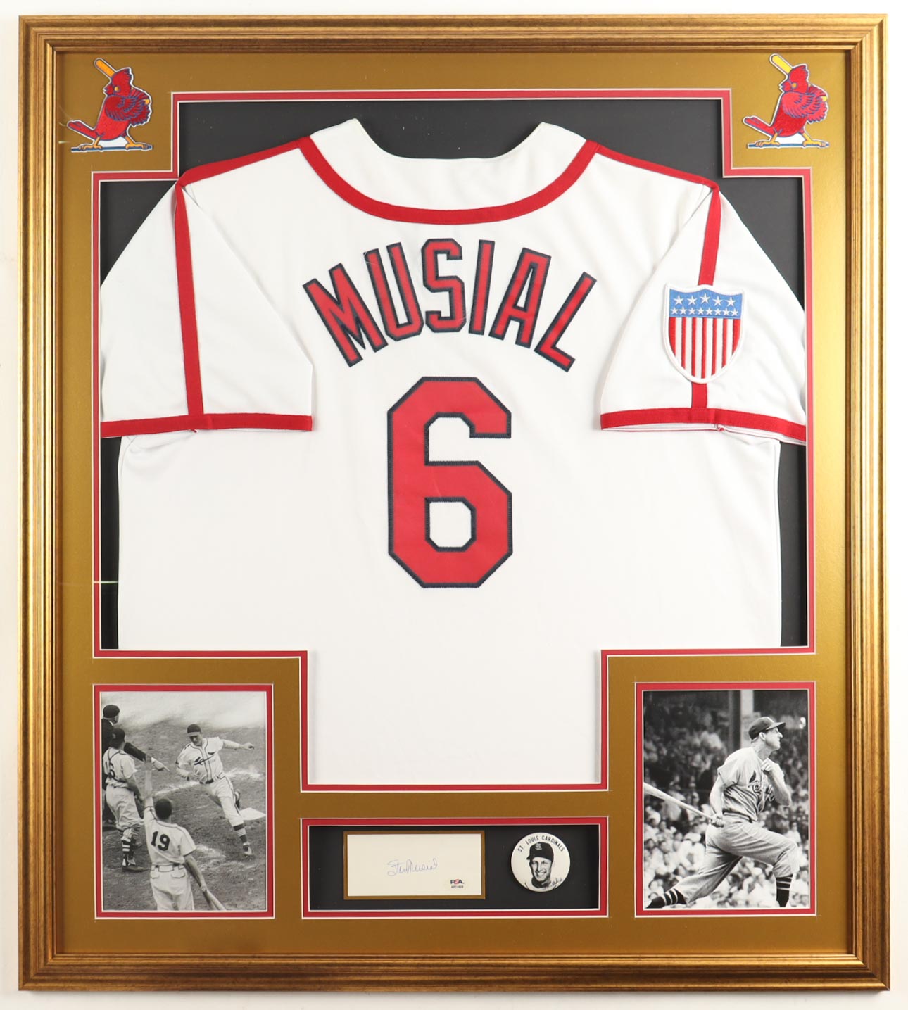 Stan Musial Signed Custom Framed Cut Display with Jersey & 1960 Team Issue Stan Musial Lapel Pin (PSA)