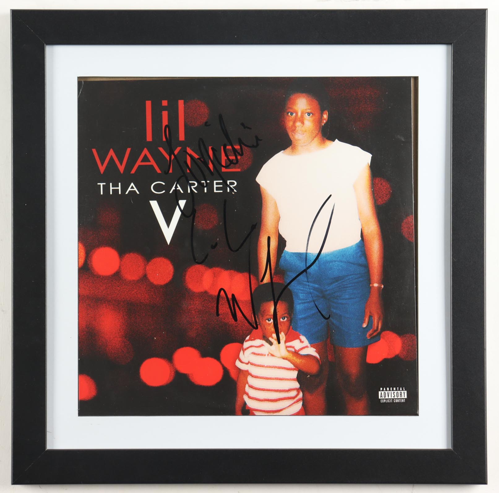Custom frame measures 17" x 17". Album includes record, sleeve and insert. Sleeve has been hand-signed and inscribed by Lil Wayne.