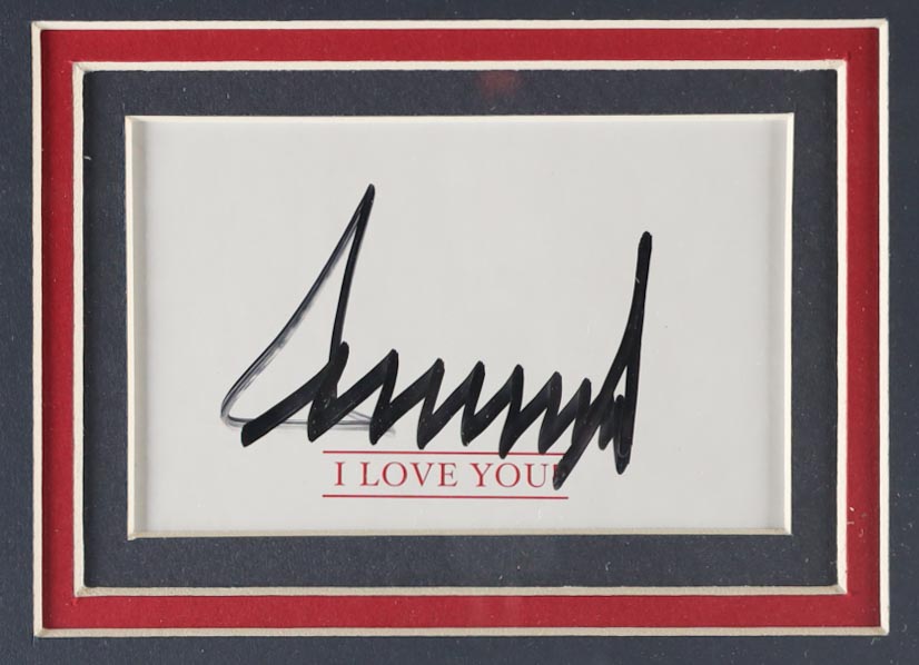 Custom framed display measures approximately 15" x 17.5" in size and features a cut hand-signed by Donald Trump.