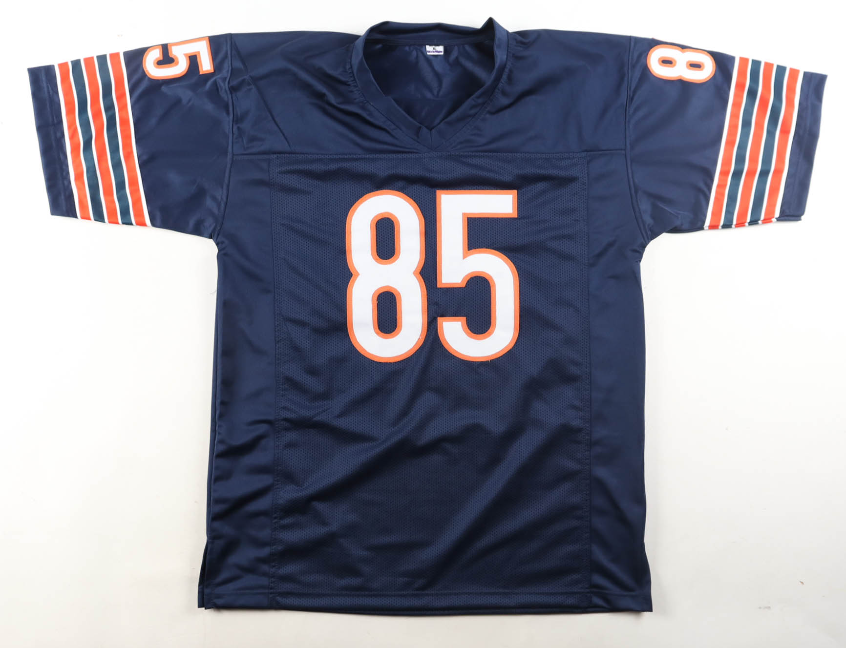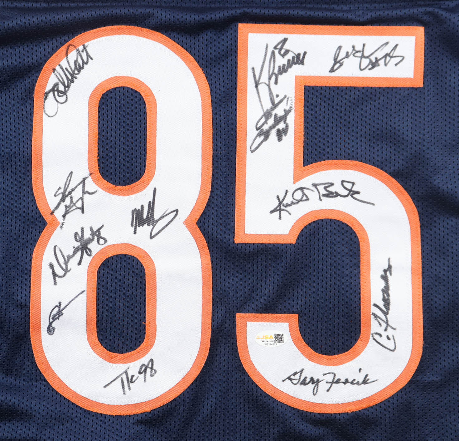 Custom jersey with everything sewn on, size XL. Hand-signed by (12) with Mike Singletary (HOF), Willie Gault, Shaun Gayle, Stefan Humphries, Kevin Butler, Dennis Gentry, Calvin Thomas, Dennis McKinnon, Kurt Becker, Tyrone Keys, Brian Baschnagel, and Gary Fencik. Please note, some signatures have bled.