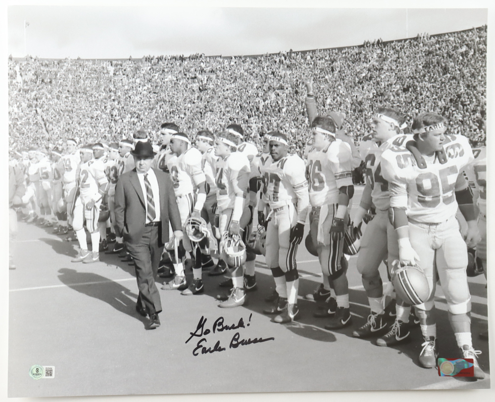 Photo measures approximately 16" x 20" in size and has been hand-signed and inscribed by Earle Bruce (D. 2018).