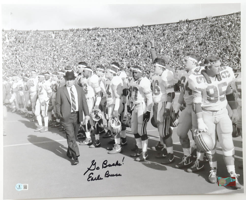Photo measures approximately 16" x 20" in size and has been hand-signed and inscribed by Earle Bruce (D. 2018).