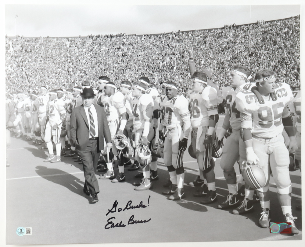Photo measures approximately 16" x 20" in size and has been hand-signed and inscribed by Earle Bruce (D. 2018).