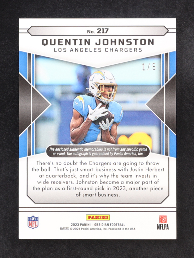 Quentin Johnston 2023 Panini Obsidian Electric Etch Deep Sea Mojo #217 Jersey Autograph RC #1/5