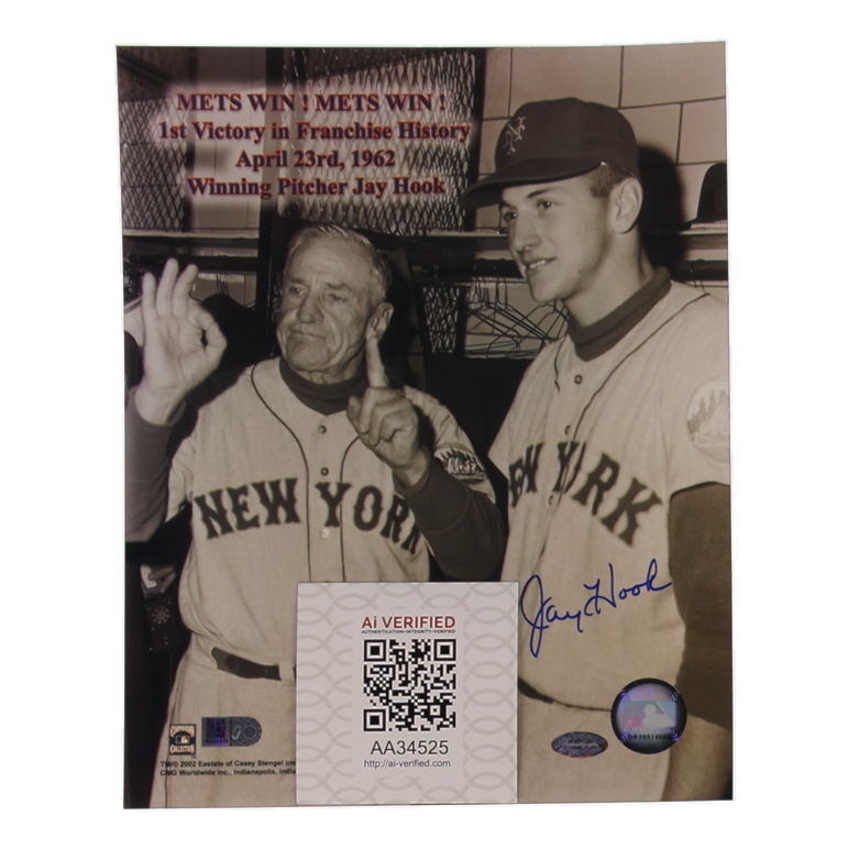Photo measures 8" x 10" in size and has been hand-signed by Jay Hook (New York Mets).