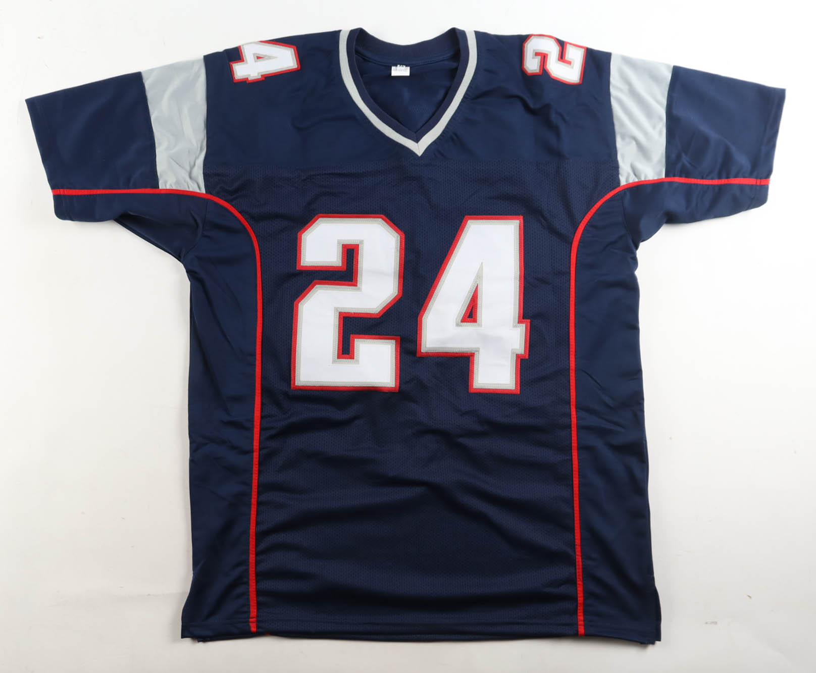 Custom jersey with everything sewn on, size XL. Hand-signed and inscribed by Ty Law (HOF).