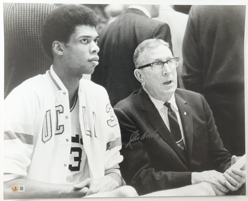 Photo measures approximately 16" x 20" in size. Hand-signed by John Wooden (D. 2010, HOF).