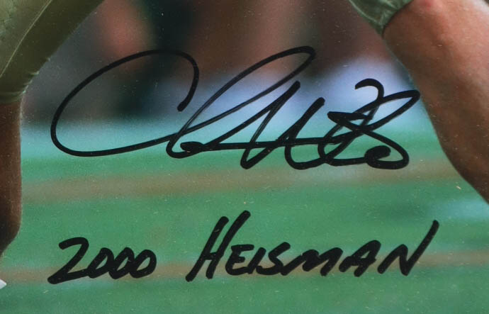 Custom frame measures approximately 23" x 27" in size and features a cut that has been hand-signed and inscribed by Chris Weinke. Please see photos for details regarding the item.