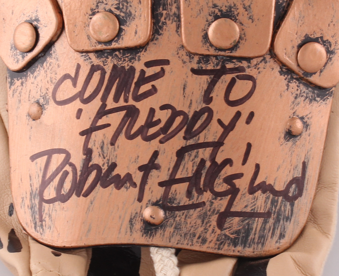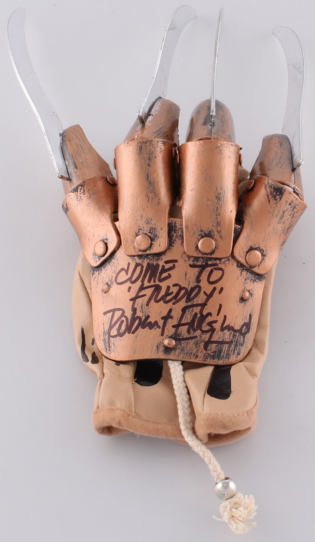Replica Freddy Krueger licensed adult size glove. Hand-signed and inscribed in black felt-tip pen by Robert Englund (Freddy Krueger). The glove has a cloth glove base, antiqued plastic hand and knuckle guards with moveable joints, and soft plastic blades that look like metal.