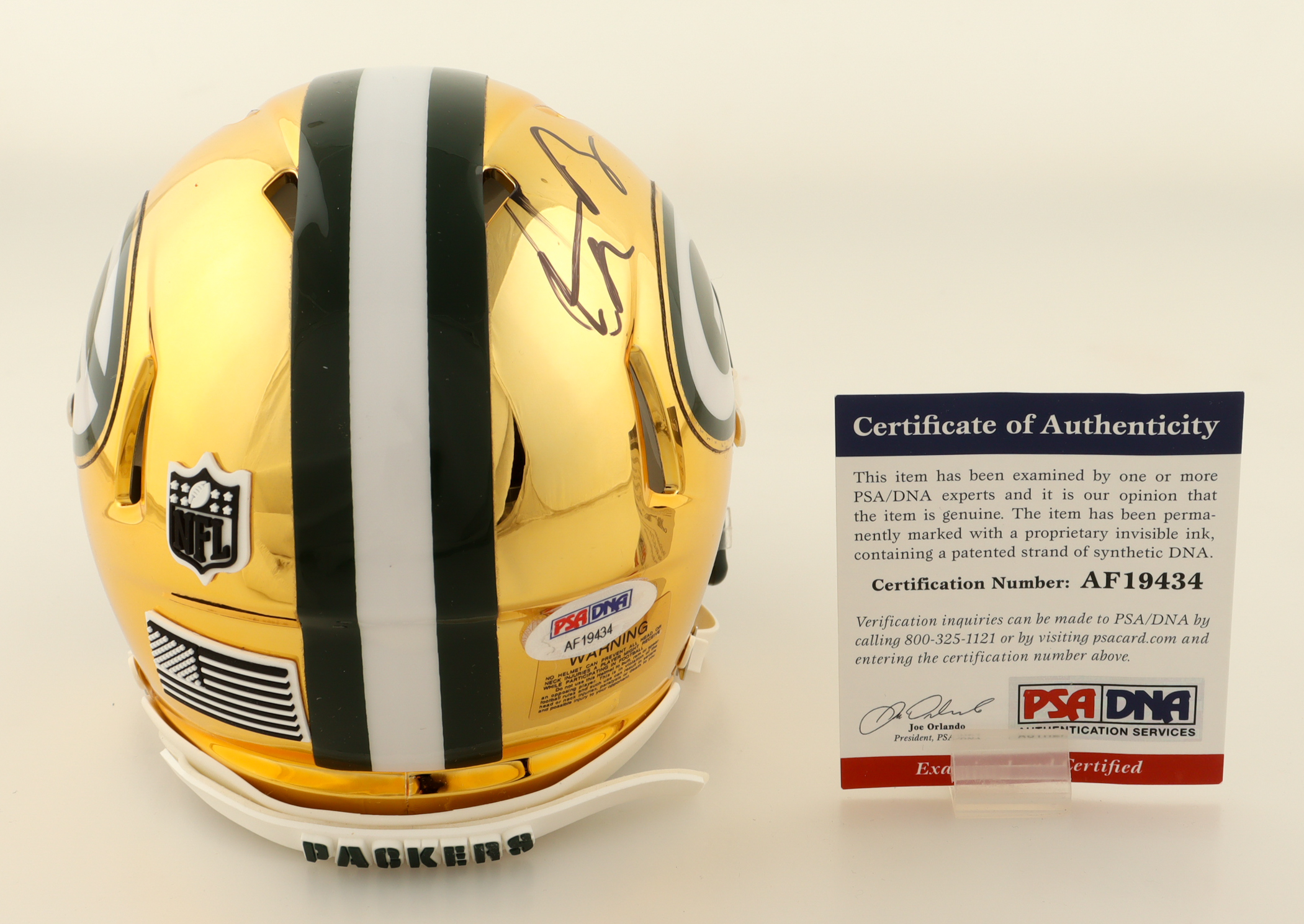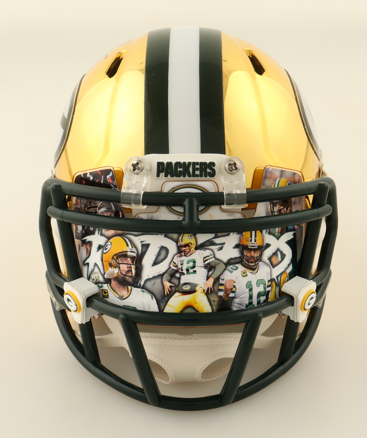 Riddell Green Bay Packers Chrome Alternate Speed mini helmet has been hand-signed by Aaron Rodgers. Visor included.