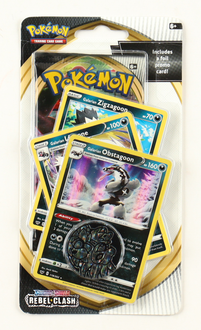 The Pokemon TCG S&S: Rebel Clash Blister Booster Pack includes (3) standard-sized cards featuring characters from the Rebel Clash set like Obstagoon and Zigzagoon. Manufactured in 2020 by Pokemon, this pack is part of the popular Pokemon Trading Card Game and comes with special promos and a coin.