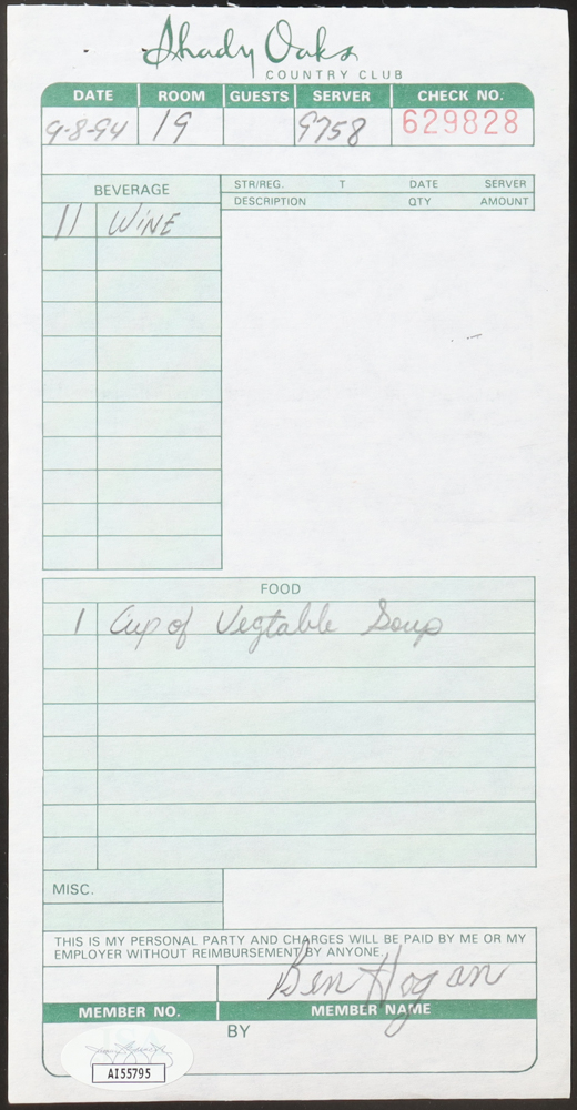 Ben Hogan Signed Shady Oaks Country Club Receipt (JSA)