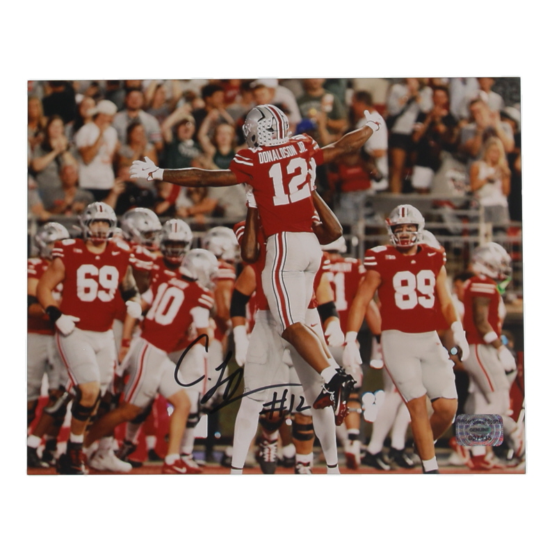 Photo measures 8" x 10". Hand-signed by CJ Donaldson (Ohio State Buckeyes).