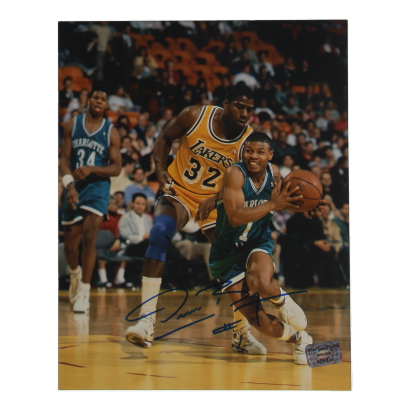 Photo measures 8" x 10" in size and has been hand-signed by Muggsy Bogues (Charlotte Hornets).