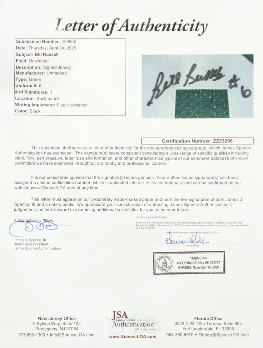 Bill Russell Signed Jersey (JSA & Hollywood Collectibles)