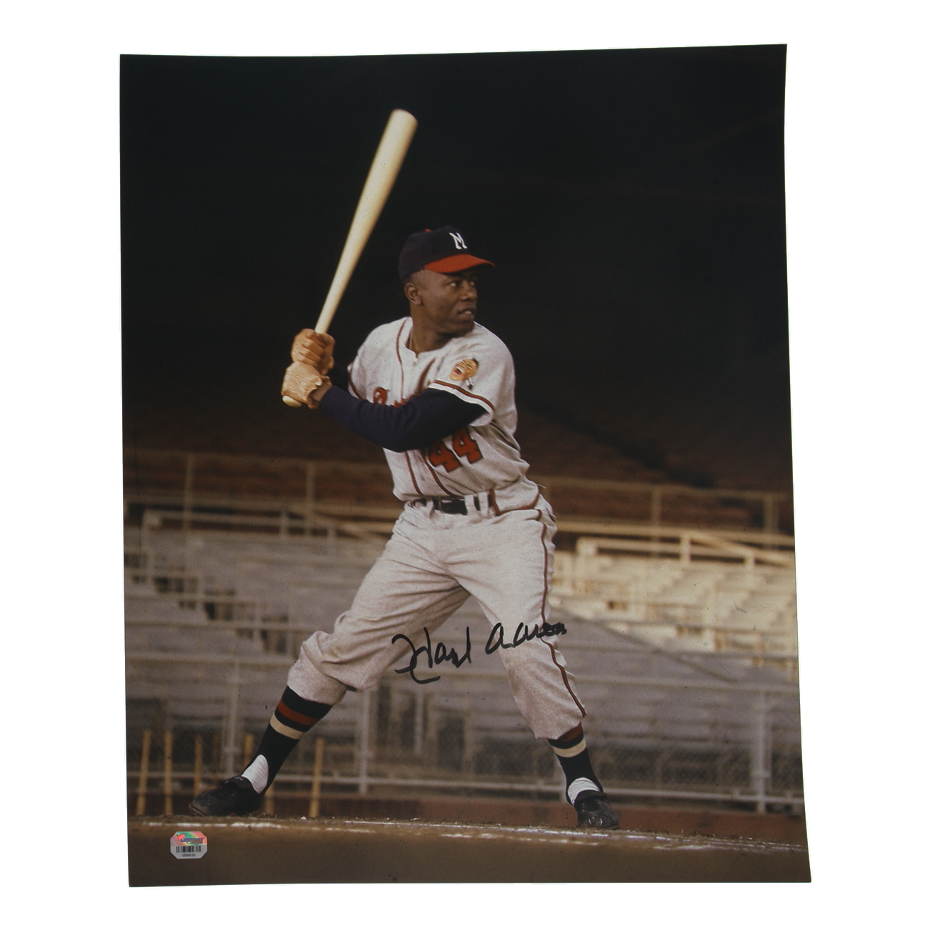 Photo measures 16" x 20" in size and has been hand-signed by Hank Aaron (Atlanta Braves).