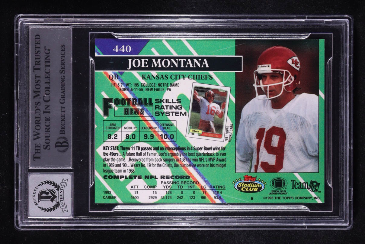 Joe Montana Signed 1993 Topps Stadium Club #440 (BGS | Autograph Graded BGS 10)