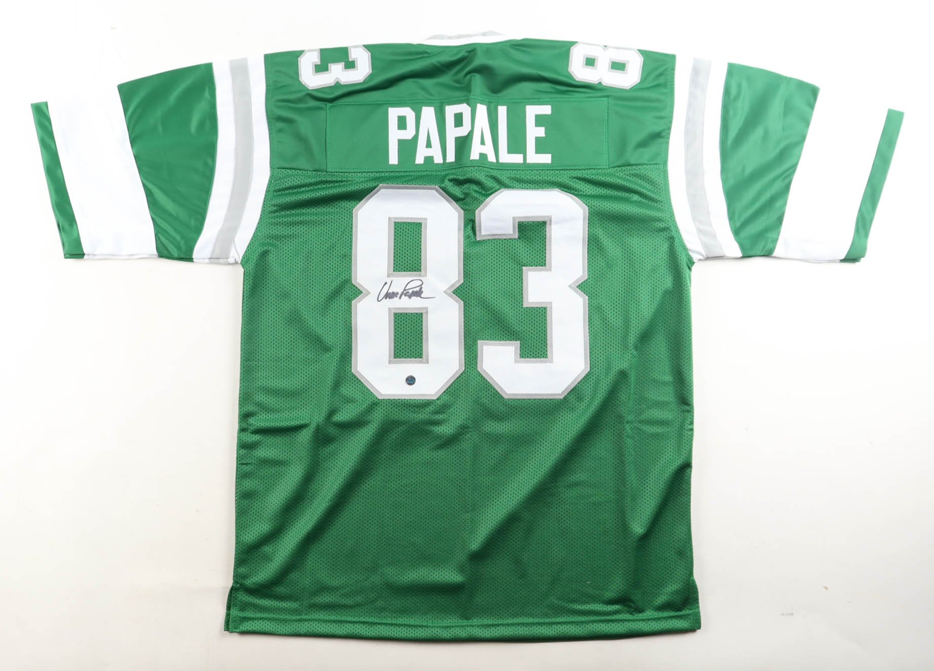Custom jersey with everything sewn on, size XL. Hand-signed by Vince Papale. Please note, the signature has bled.