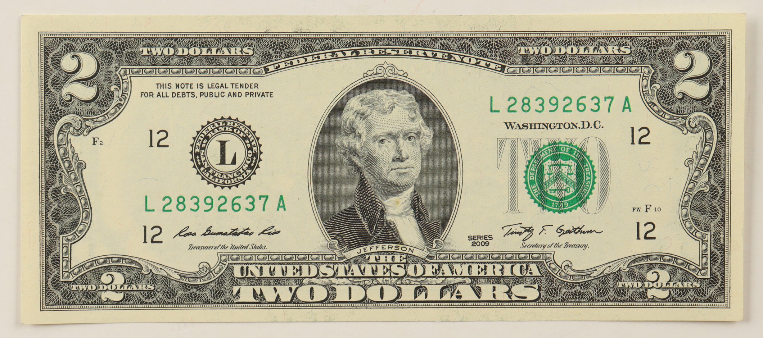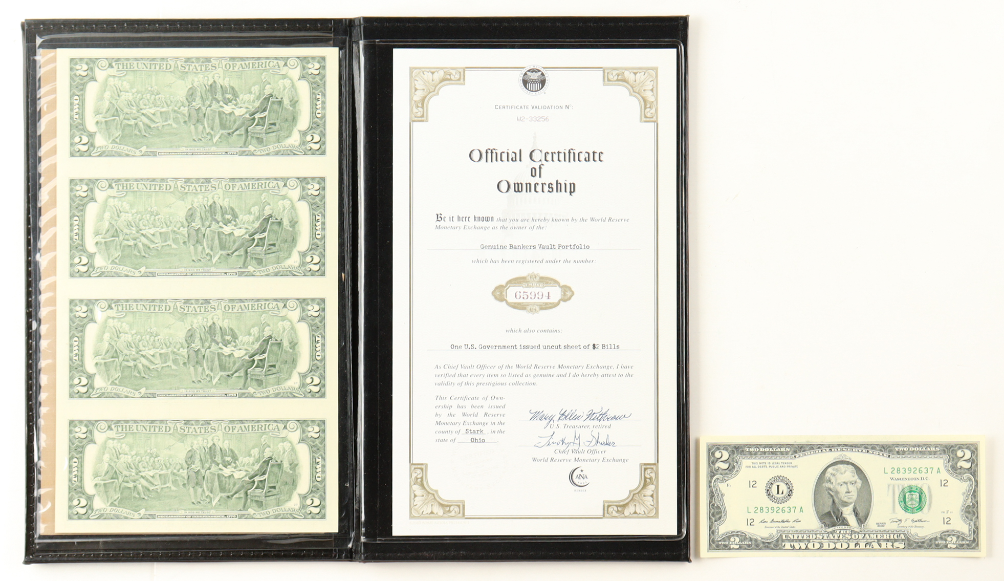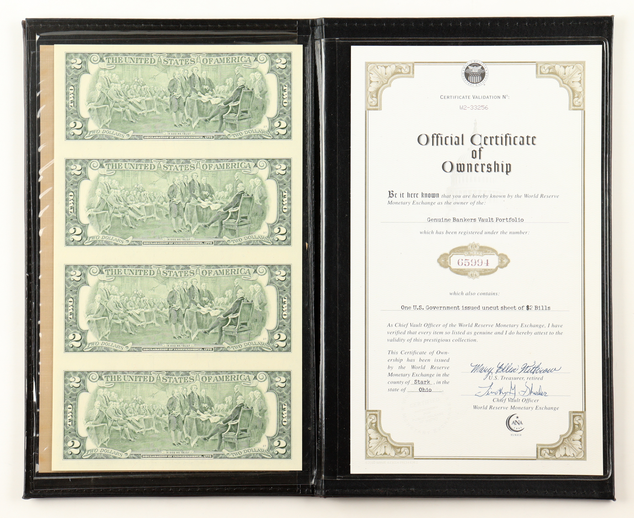 2003-A U.S. $2 Two Dollars Uncut Sheet of (4) Federal Reserve Notes in Leatherette Folder With 2009 $2 Two Dollar Bill