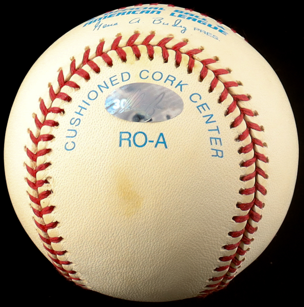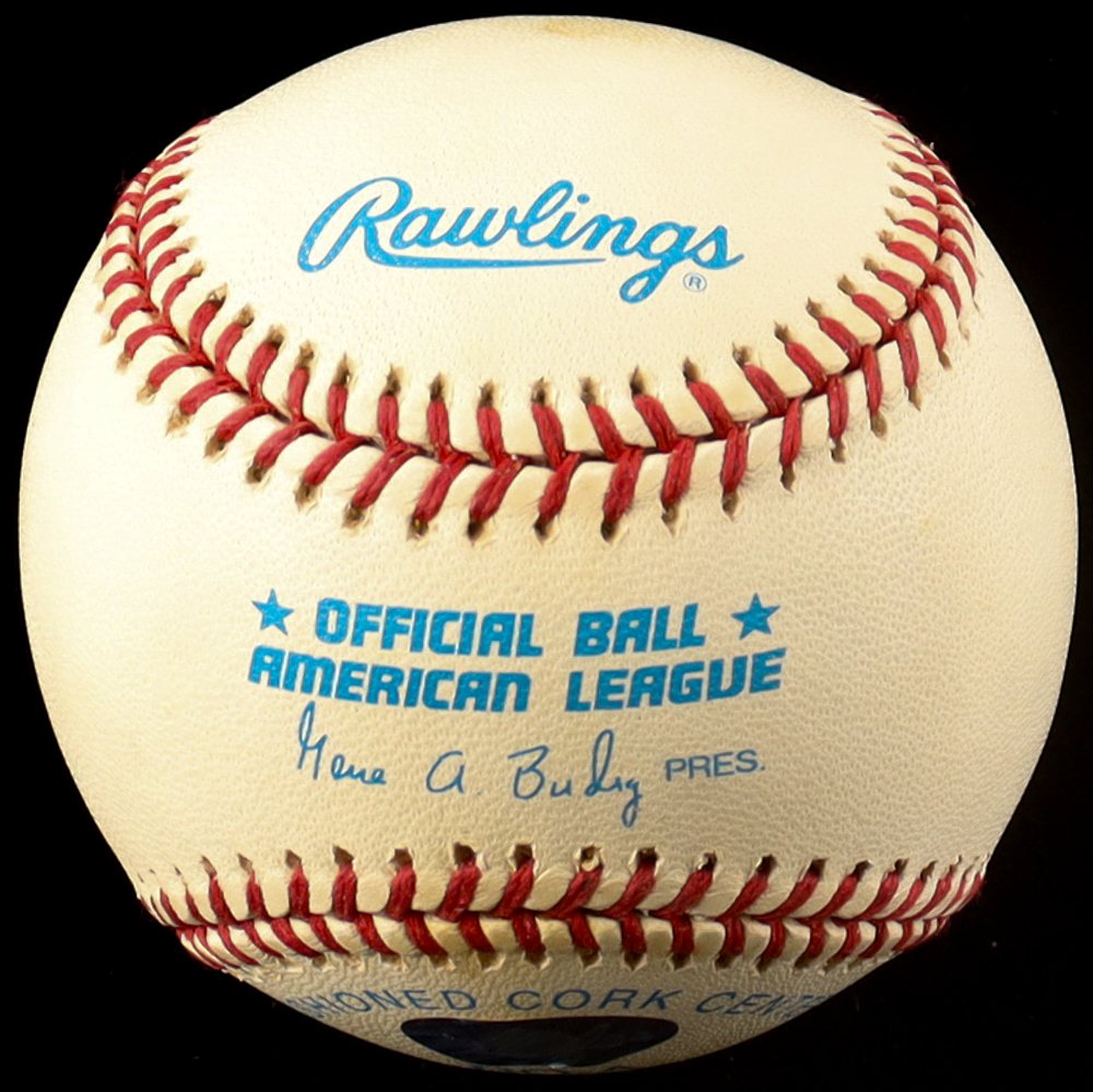 Rawlings Official American League Baseball. Hand-signed by Nolan Ryan (Texas Rangers, HOF). Please note, the baseball is naturally toning and stained.
