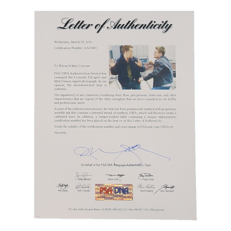 Photo measures 11" x 14" in size and has been hand-signed by Leonardo DiCaprio and Matt Damon.