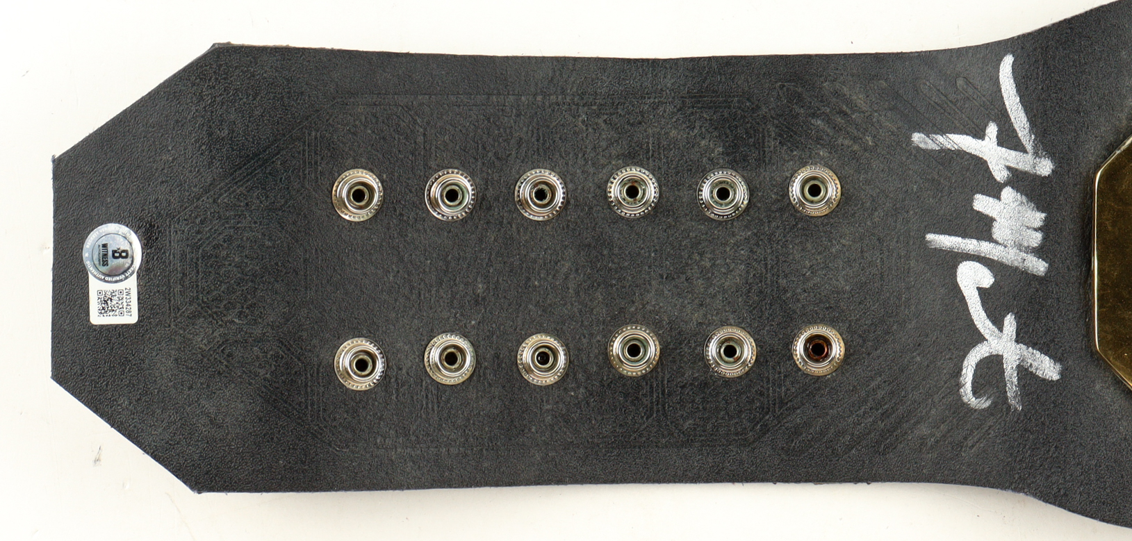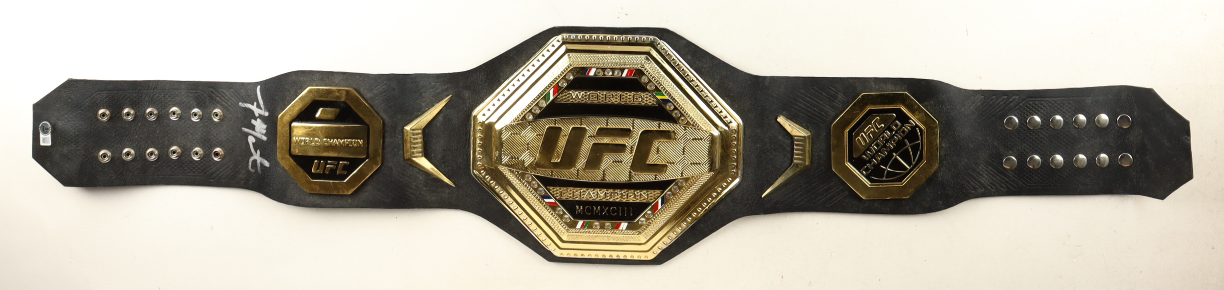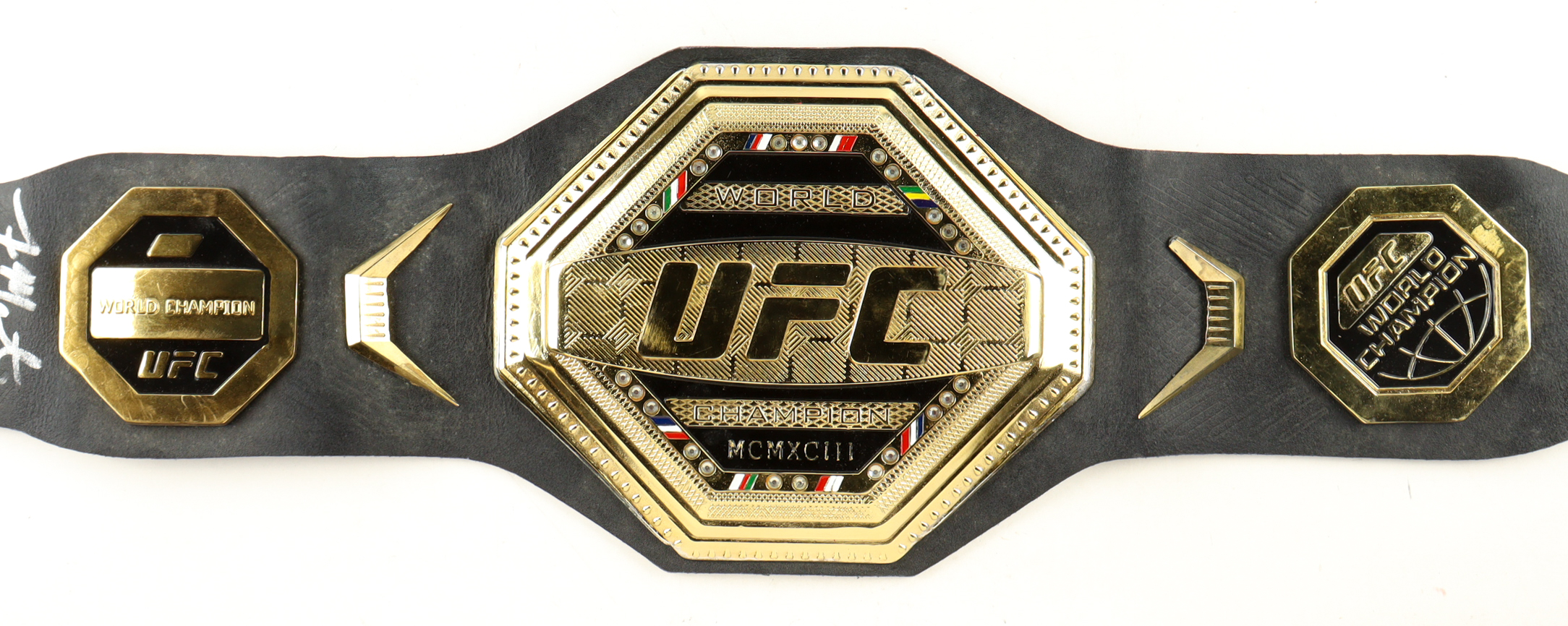 This full-size high-quality replica belt is faux leather and features metal plates. Hand-signed by Aljamain Sterling.