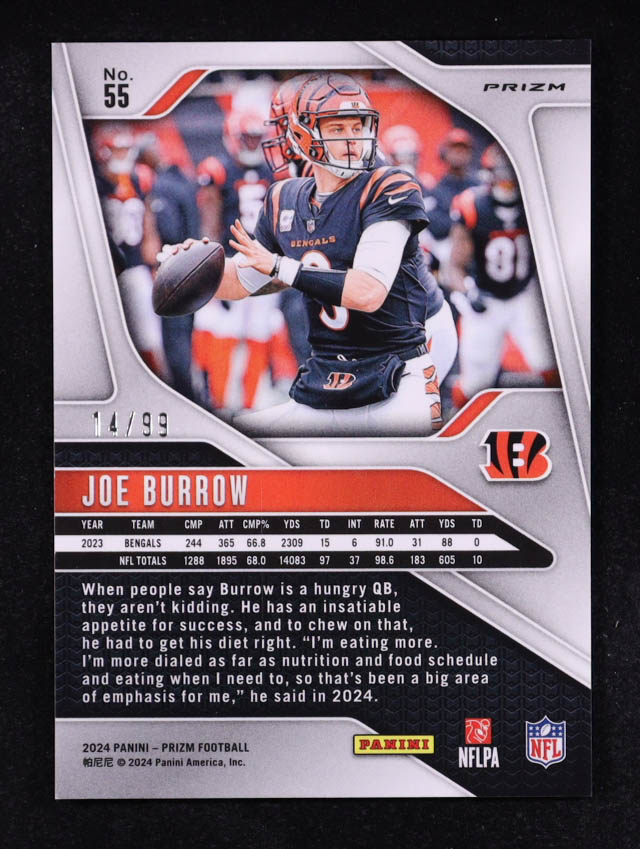 Joe Burrow 2024 Panini Prizm Prizms No Huddle Blue #55 #14/99