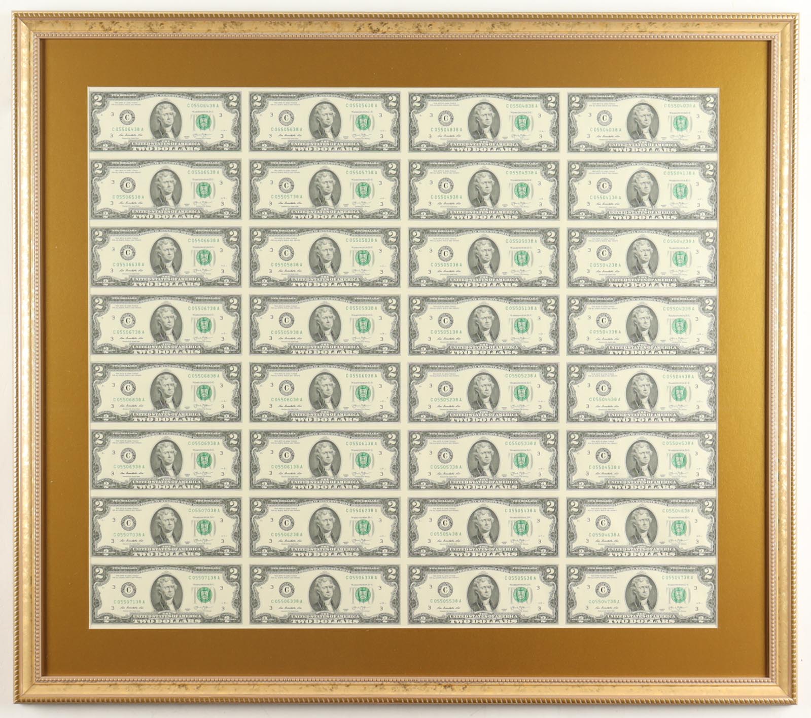 Custom frame measures approximately 27" x 30" in size and features an uncut sheet of (32) 2013 U.S. $2 dollar bills. Please note, the display is unsigned.
