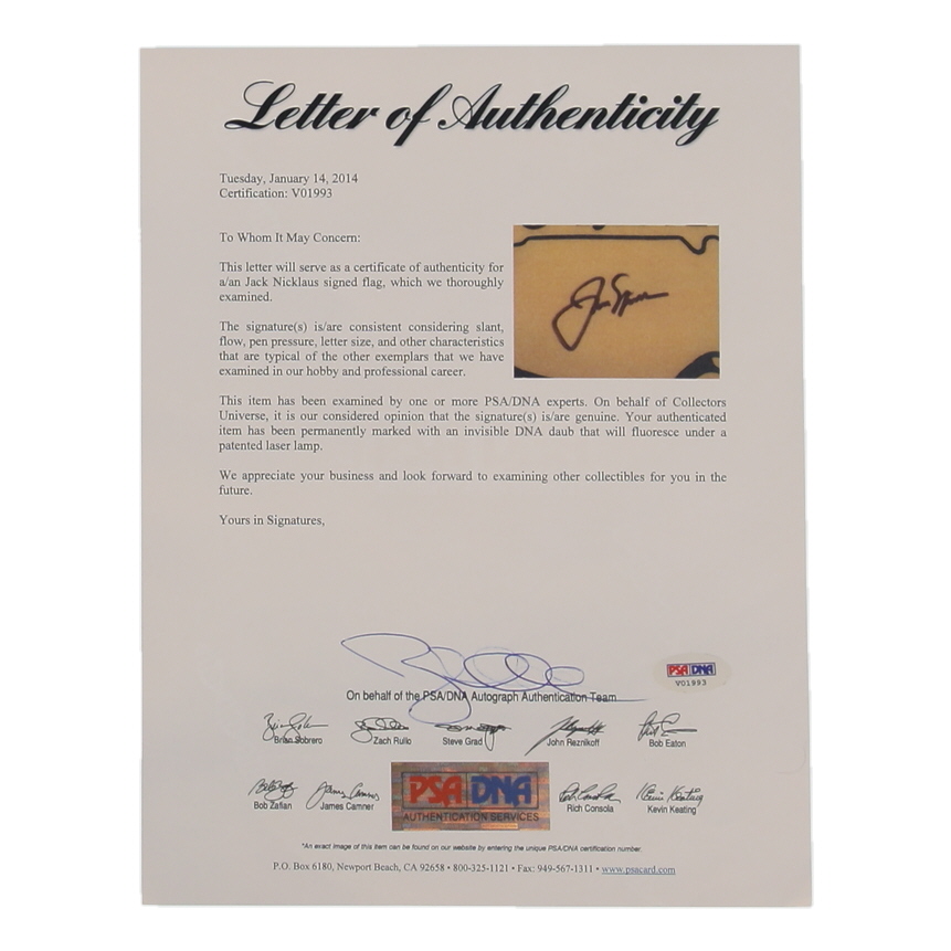 Pin flag measures approximately 13" x 17" in size and has been hand-signed by Jack Nicklaus (HOF).