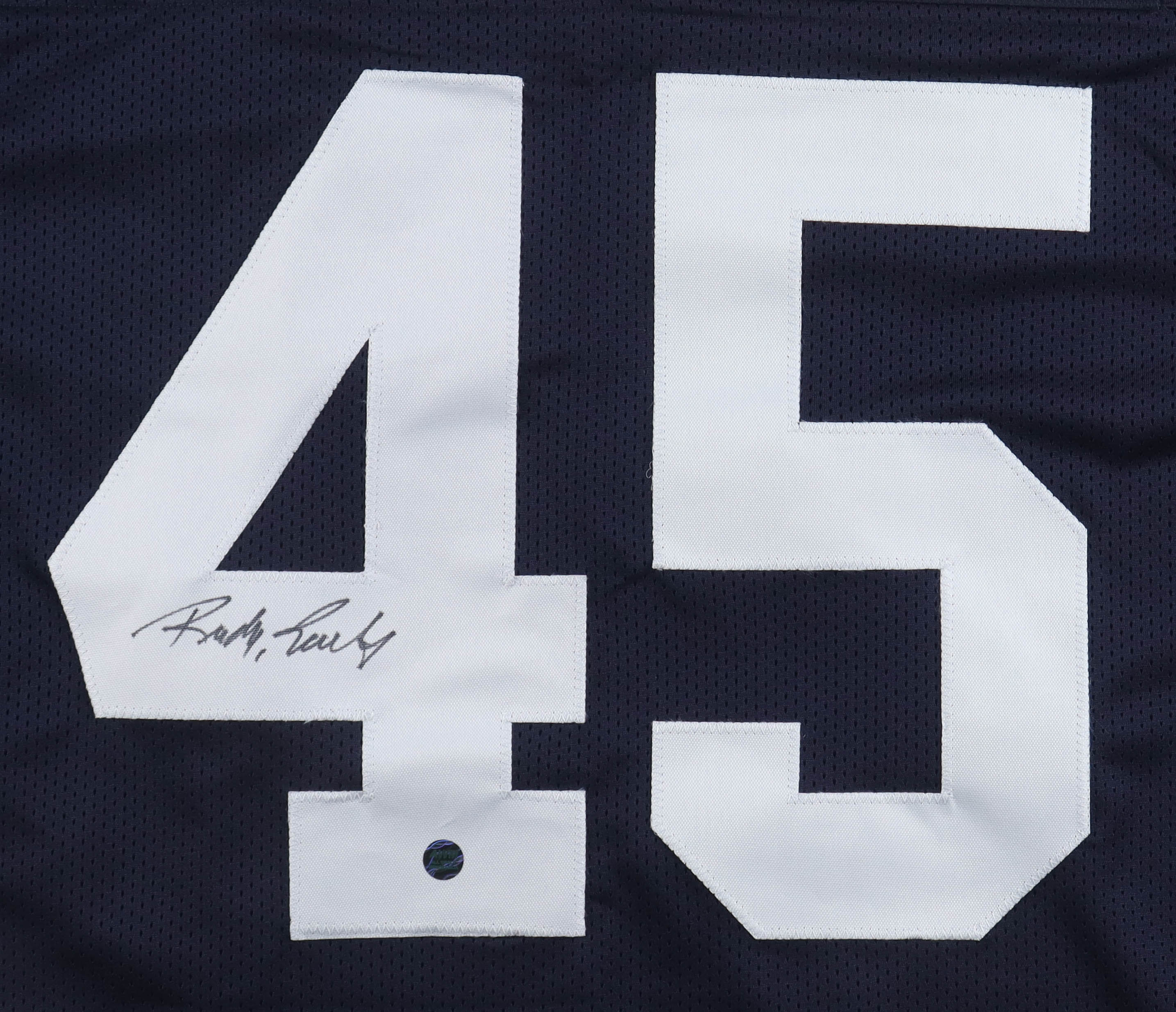 Custom jersey with everything sewn on, size XL. Hand-signed by Rudy Ruettiger.