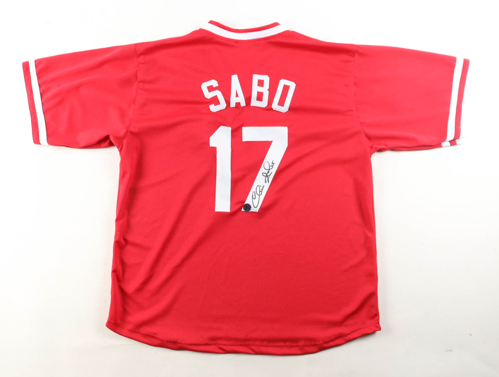 Custom jersey. Everything is sewn on, size XL. Hand signed by Chris Sabo.