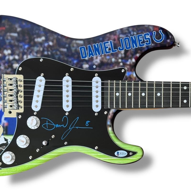 Custom Autograph Edition Stratocaster style electric guitar measures approximately 39" in length and has been hand-signed on the pickguard by Daniel Jones (Indianapolis Colts).