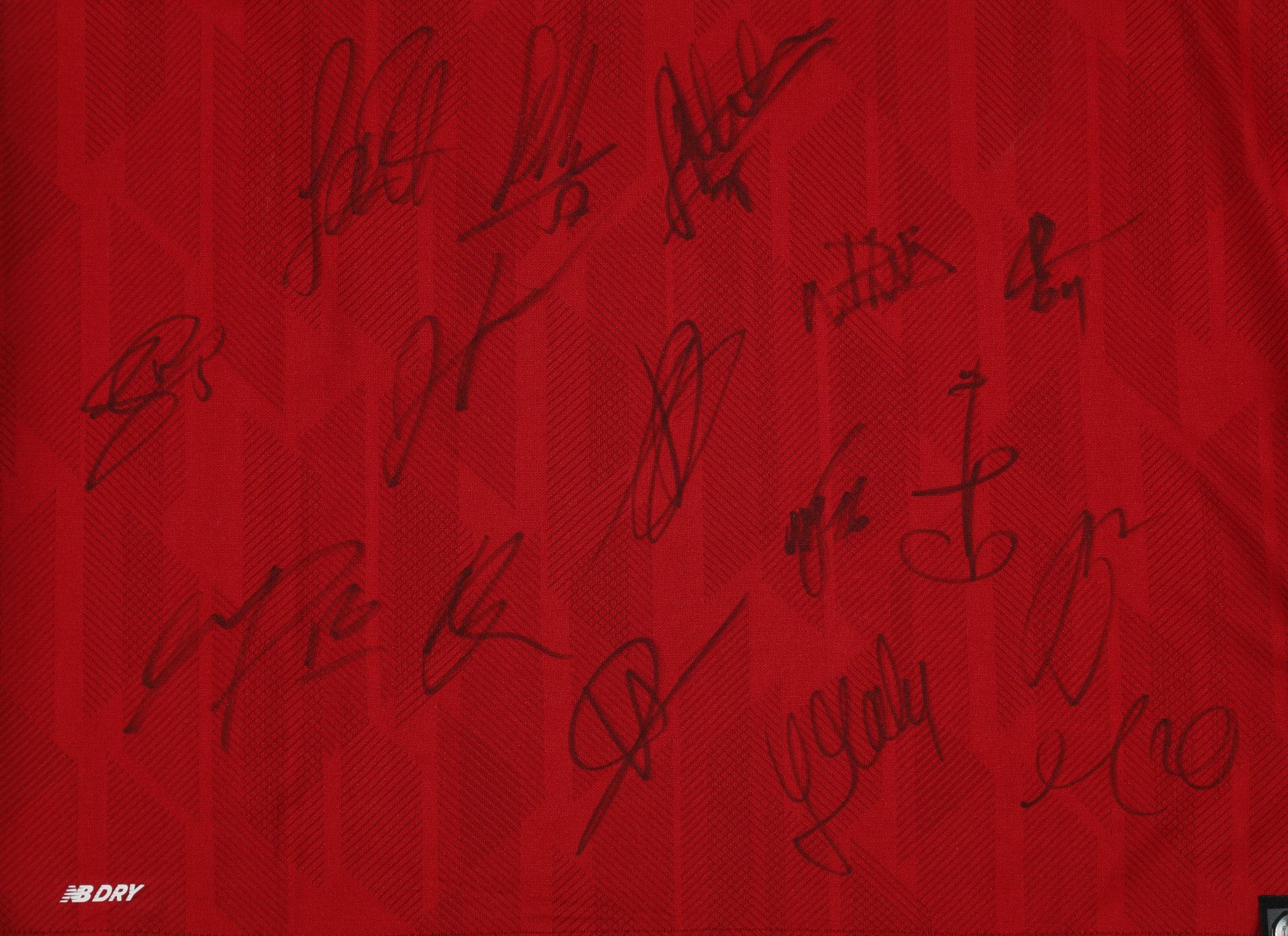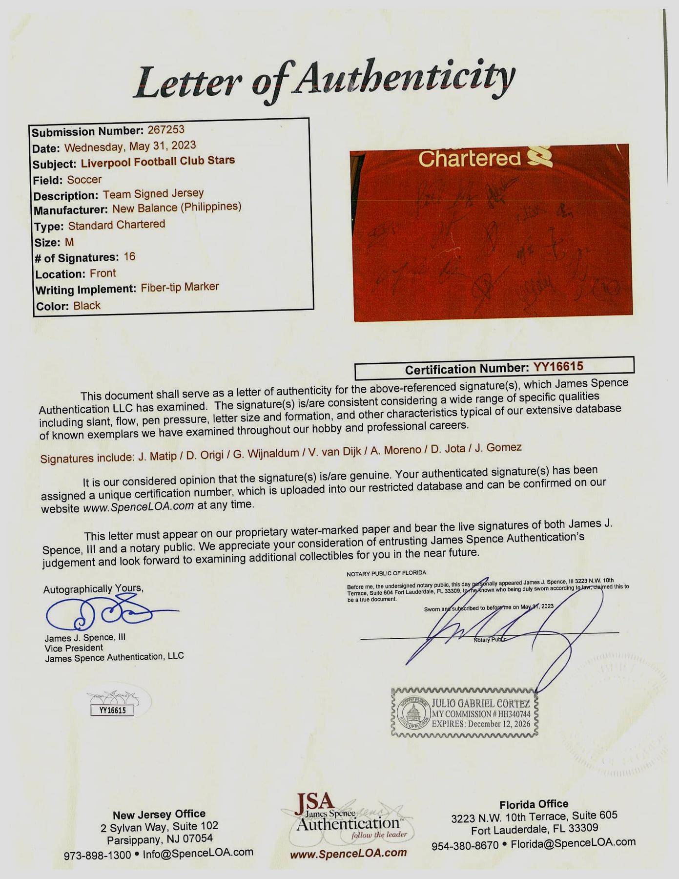 New Balance Authentic jersey has been hand-signed by (16) with Joel Matip, Divock Origi, Georginio Wijnaldum, Virgil Van Dijk, Alberto Moreno, Diogo Jota, Joe Gomez, and (9) others.