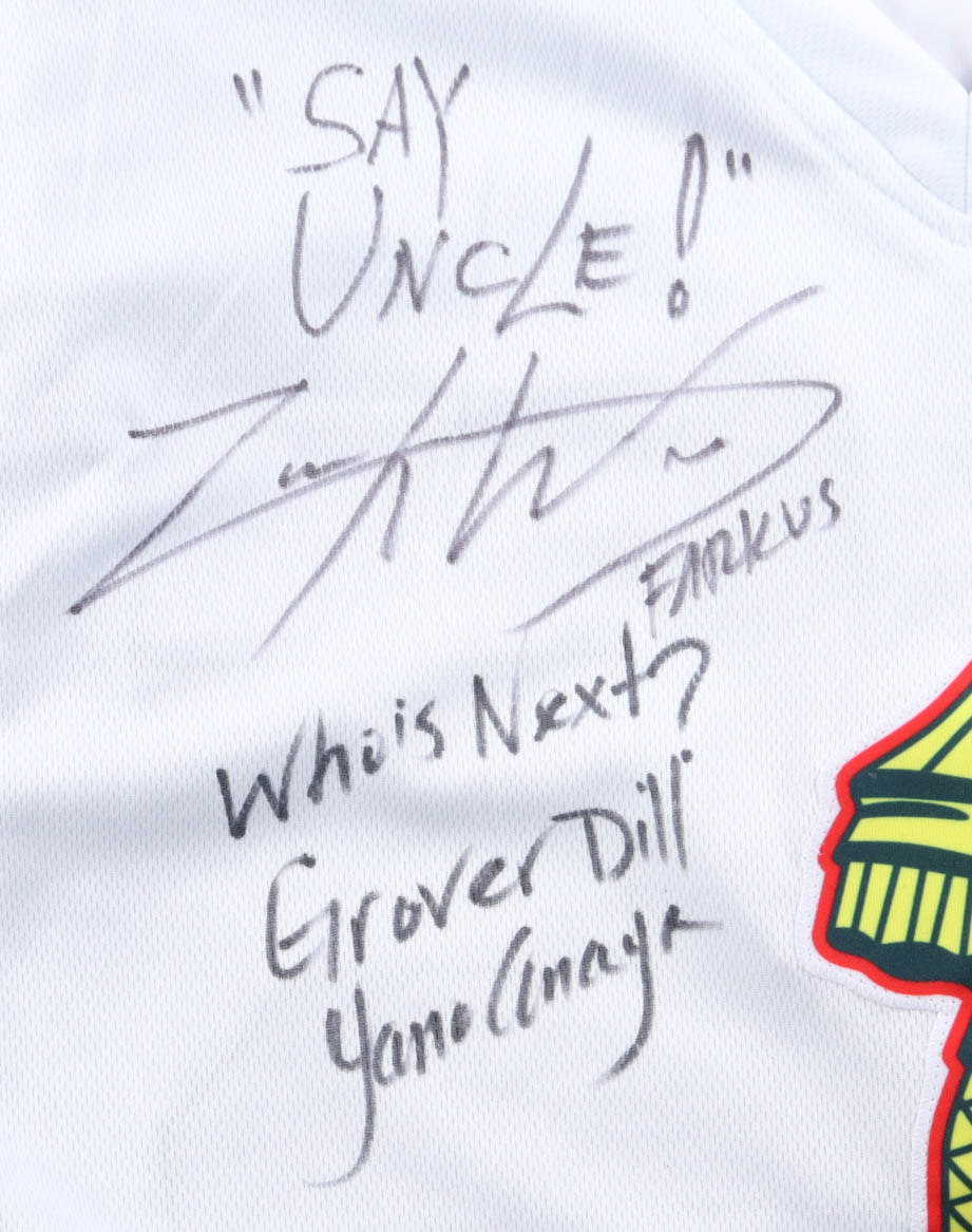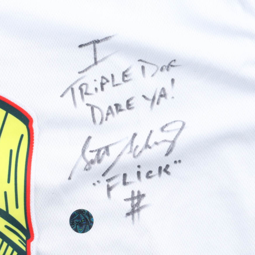 Custom jersey with everything sewn on, size XL. Hand-signed and inscribed by Zack Ward (Scut Farkus) & Scott Schwartz (Flick).