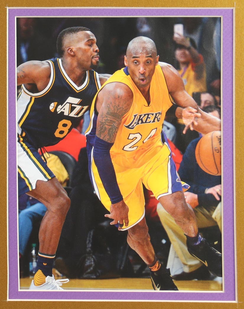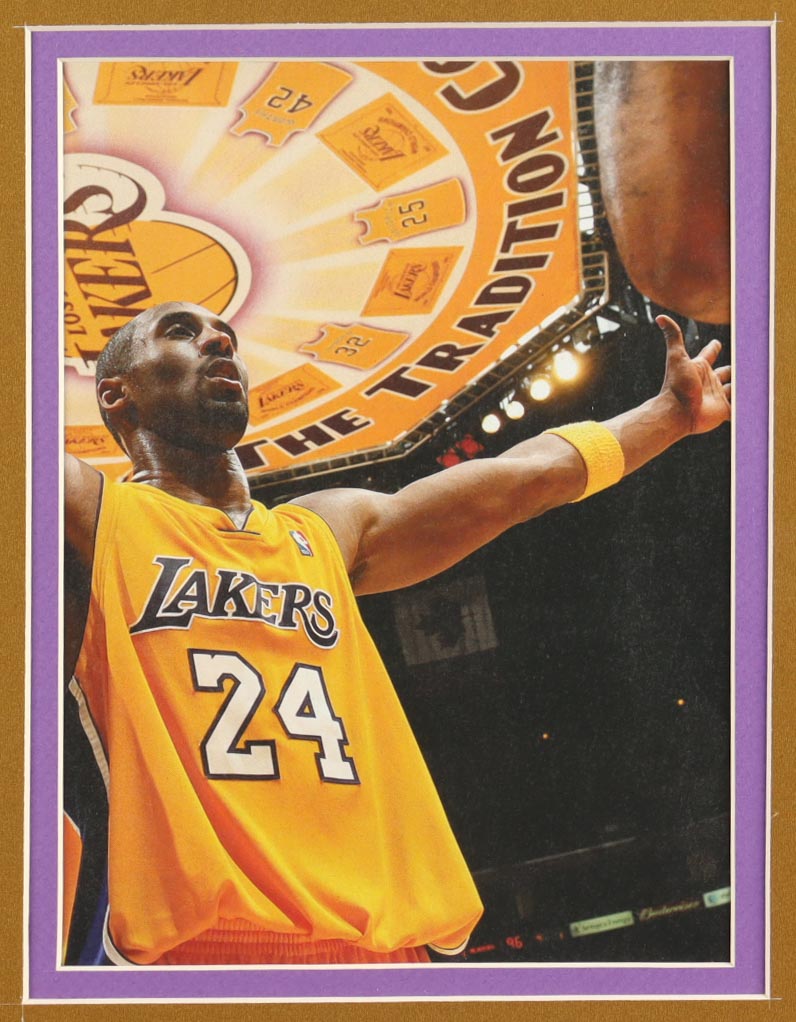 Custom frame measures approximately 32" x 36" in size and features an unsigned Kobe Bryant (D. 2020, HOF) Jersey. The display also includes (2) 8" x 10" Photos, (2) Team Logo Patches and (3) Championship pins. Please note, the display is unsigned.