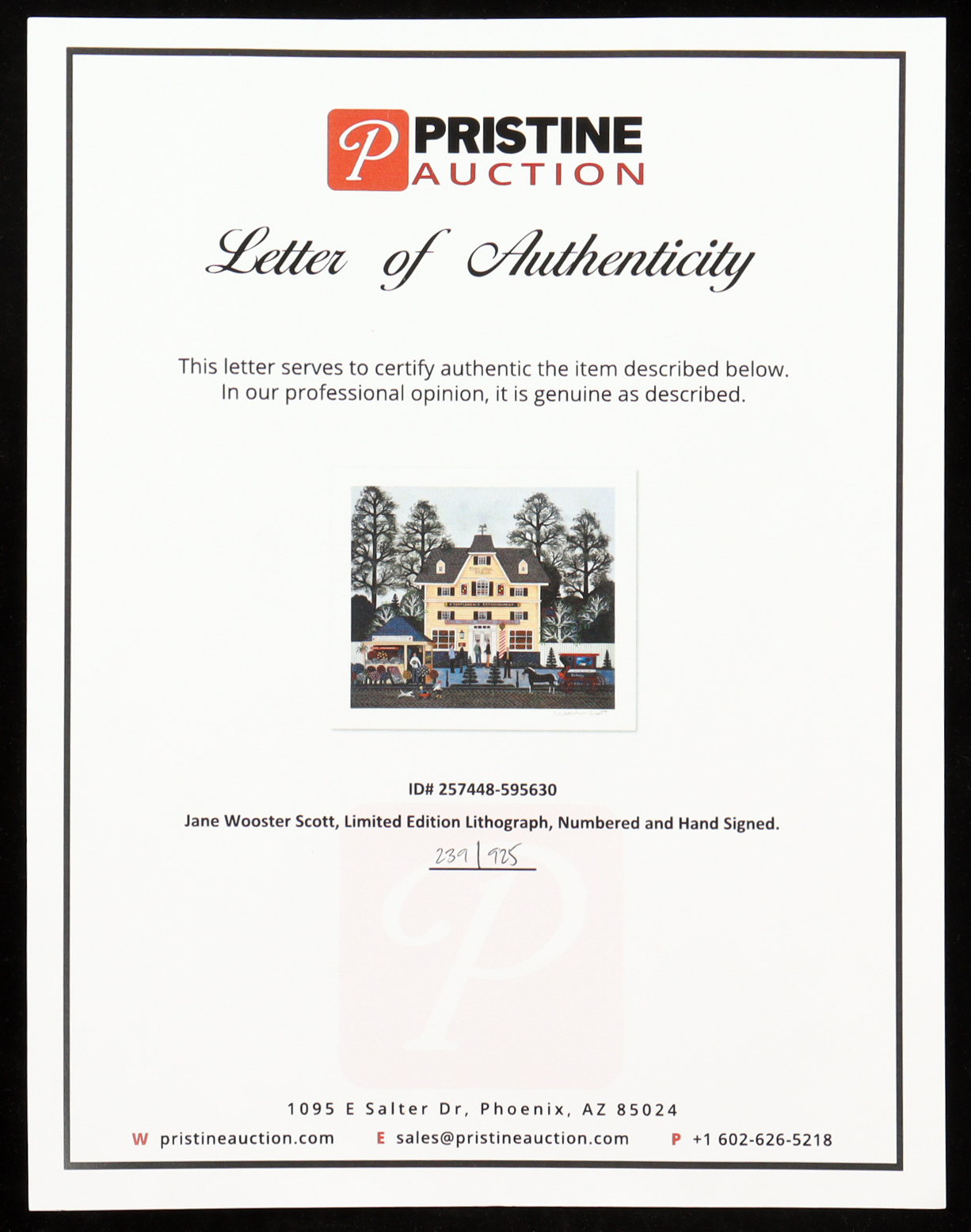 Lithograph measures approximately 12.5" x 14.5" in size and has been hand-signed by Jane Wooster Scott. Please note, the lithograph is limited edition and has been hand-numbered #239/925.