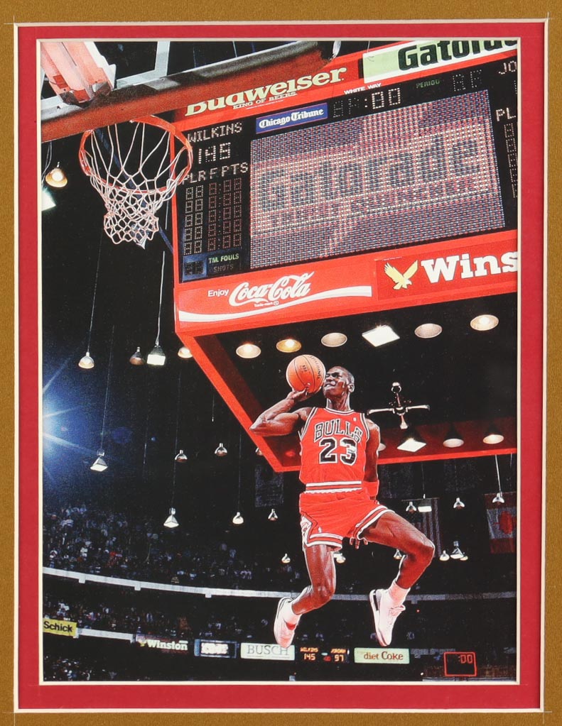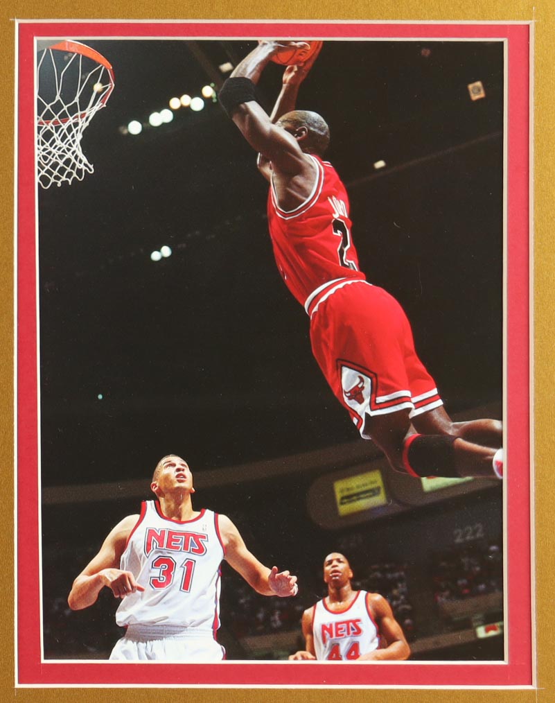 Custom frame measures approximately 33" x 37" in size and features an unsigned Michael Jordan (HOF) jersey. The display also includes (2) Photos, (3) Champions Pins and a Career Statistics Plaque. Please note, the display is unsigned.