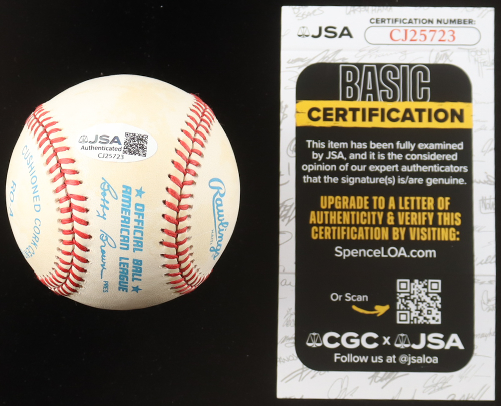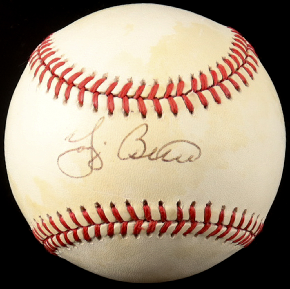 Rawlings Official American League Baseball. Hand-signed by Yogi Berra (D. 2015, New York Yankees, HOF). Please note, the baseball is naturally toning and stained.